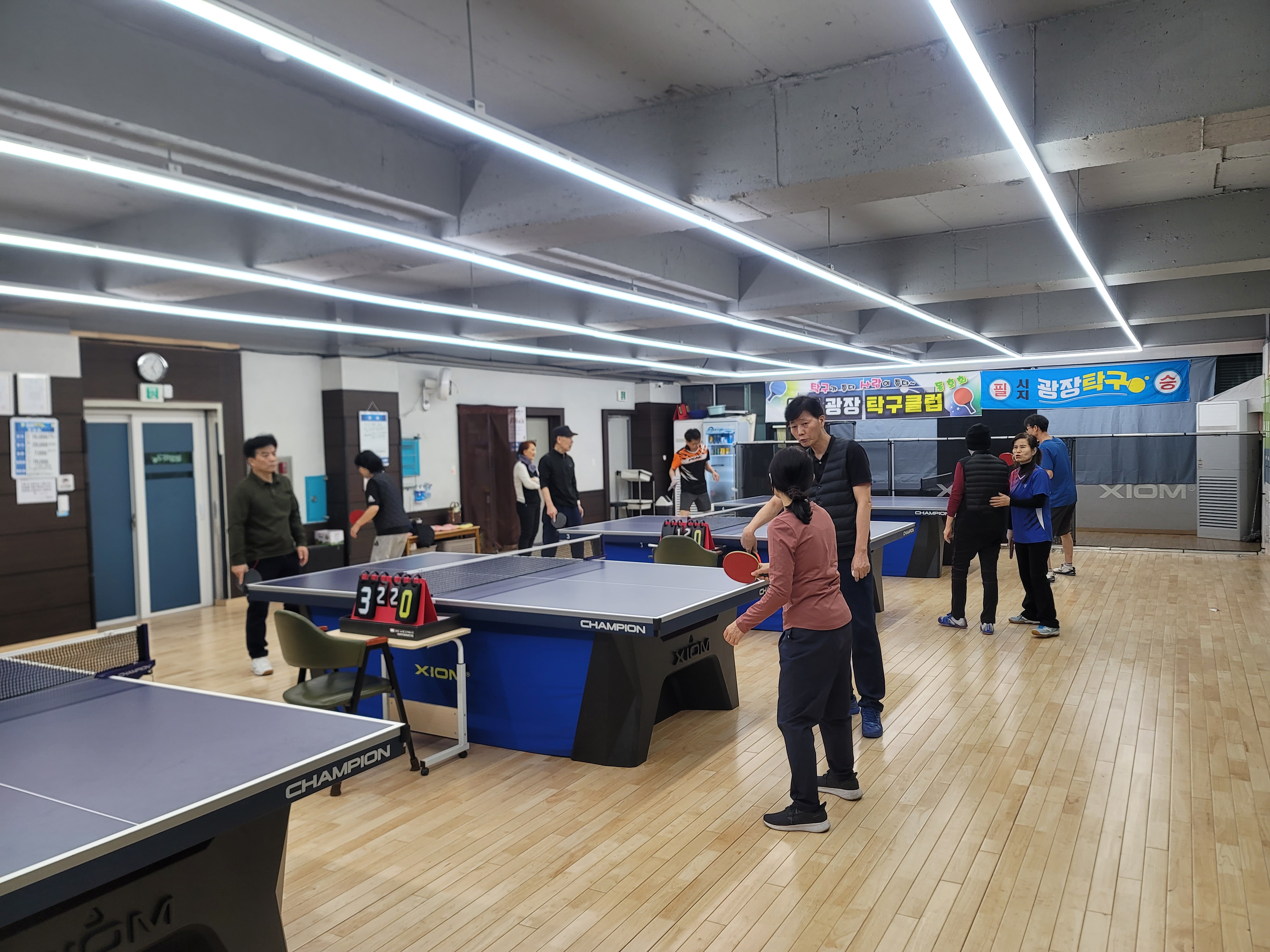 <방문기> 공격형 수비수인 지인 한 분(대구 5부)이 이 구장에서 운동을 하고 있어서 2025년의 마지막 날에 찾아가 보았다. [광장탁구클럽]은 3년 전에 생긴 신생 구장으로 아직도 탁구대(Champion Pro9S)며 마룻바닥이 깔끔했다. 탁구장 규모는 일반 탁구대 4대, 레슨 탁구대 1대 총 5대가 들어가는 아담한 사이즈였다. 무엇보다 인상적이었던 것은 고급 소재인 탄성마루를 깔아서 무릎이나 발목에 무리가 가지 않도록 했다는 점이다.
